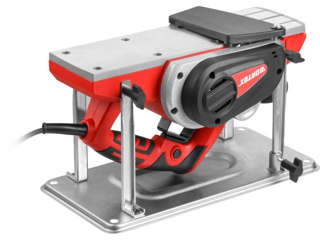 - Высокое качество обработки благодаря мощному двигателю. Также отличительной характеристикой данного инструмента является большая глубина и ширина строгания. Рубанок возможно использовать в качестве станка благодаря разборной станине, идущей в комплекте с изделием. Можно осуществлять выборку четверти. Модель обладает прорезиненной рукояткой. Подошва рубанка обладает тремя дополнительными пазами для вытачивания скошенных кромок (фаски) различной глубины. Регулировка глубины строгания имеет шаг 0,1 мм. Присутствует возможность работы совместно с пылесосом, а также пылесборным мешком, идущим в комплекте. Ременная передача между двигателем и режущим барабаном.