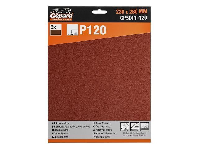 Шлифлист 230х280мм Р120 бум.осн. 5шт. GEPARD (GP5011-120)(бумага наждачная абразивная, лист шлифовальный абразивный, шлифшкурка)