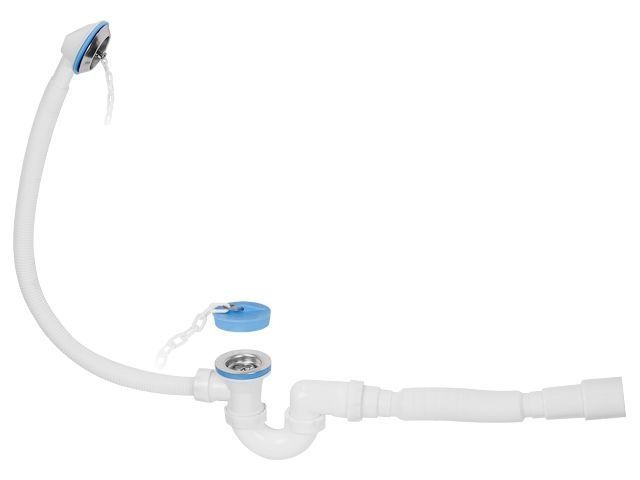 Сифон для ванны U-образный, выпуск 70 мм, с переливом; Выпуск, перелив и винт из нерж. стали 304 Длина винта 50 мм Выход в канализацию гибкая труба 1 12- 4050 мм, в комплекте с пробкой на пластикоковой цепочке
