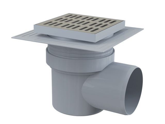 Сливной трап 150х150/110, подводка - боковая, решетка - нержавеющая сталь, воротник- 2-х уровневая