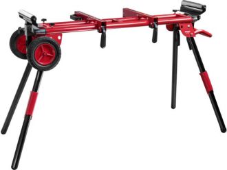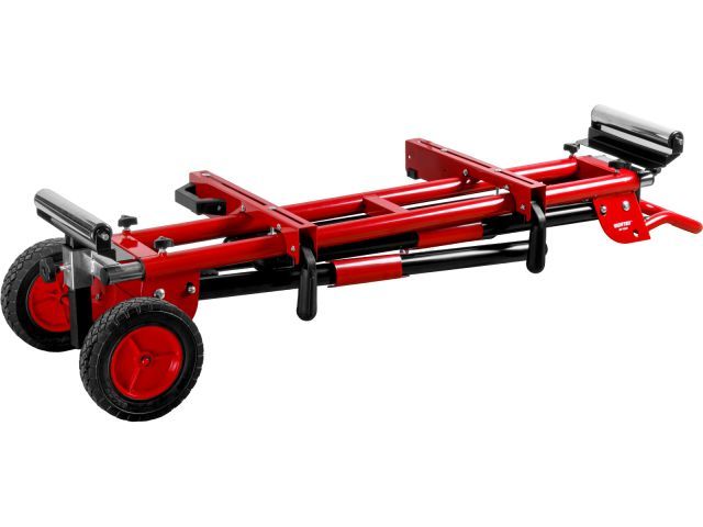 - Данная модель оснащена колёсами и рукояткой для удобного перемещения вместе с закрепленной пилой или без неё.