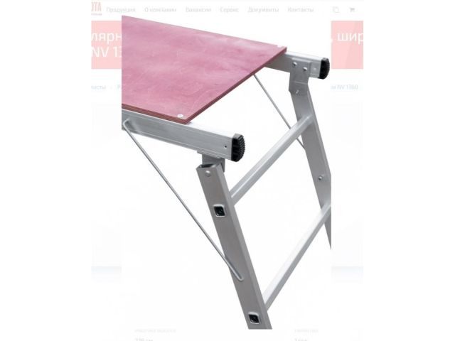 Большая рабочая площадка 755?500 мм. Удобно ставить инвентарь. Стойки и перекладины из алюминиевого профиля. Несъёмный настил из антисептированной фанеры. Рифлёные перекладины 23?23 мм для надёжного сцепления. Вальцовочное крепление перекладин. По прочности не уступает сварке. Компактно складывается для хранения и транспортировки. В сложенном состоянии занимает мало места. Башмаки из 2х-компонентного пластика с прорезиненной опорой и большим (15 см?) пятном контакта. Не скользят и не повреждают поверхность. Гарантийный срок : 1 год.