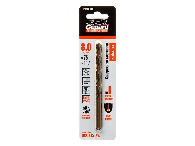 Сверло по металлу ц/х 8.0х75х117 мм HSS-Co GEPARD(кобальт 5%)