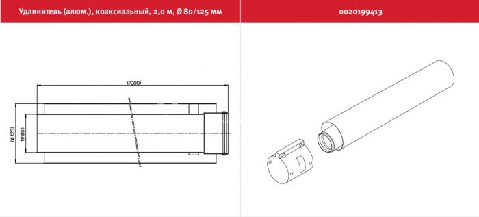 Удлинитель дымохода Protherm 0020199413, 80/125 мм, 2000 мм, алюминиевый, коаксиальный
