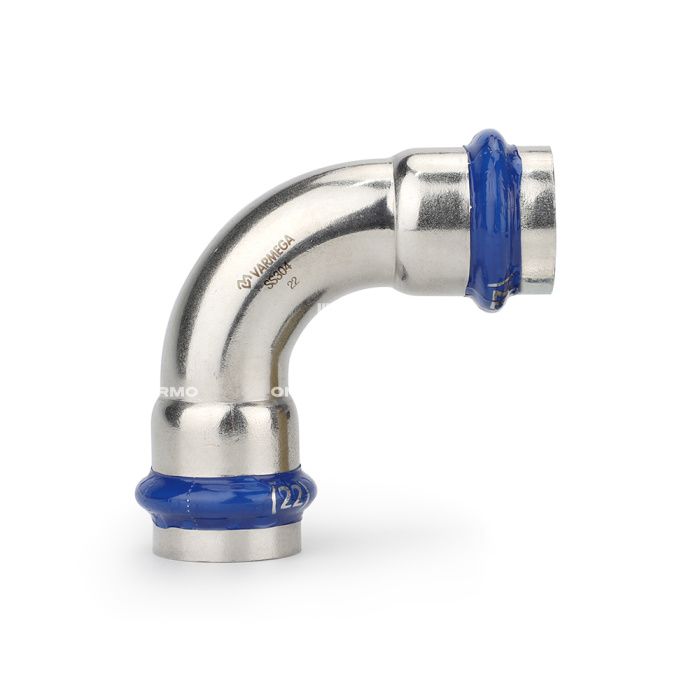 Угольник 90° двухраструбный Varmega Inox Press используется для соединения труб равных диаметров под углом 90 градусов. Для получения надежного неразъемного соединения трубы и фитинга потребуется специальный пресс-инструмент с насадками типа профиль «V». Трубы и пресс-фитинги из нержавеющей стали серии Varmega Inox Press предназначены для транспортирования жидкостей, применяемых в системах питьевого водоснабжения, низкотемпературных и высокотемпературных системах отопления и системах охлаждения. Трубы и фитинги могут применяться в качестве технологических трубопроводов для транспортирования жидкостей и газов, не агрессивных к материалу труб и уплотнителей фитингов. Особенности применения: - Запрещается использовать фитинги системы с уплотнительными кольцами из EPDM на трубопроводах, транспортирующих жидкие углеводороды. В таких случаях необходимо заменить кольца из EPDM на кольца из FPM (Viton). Кольца FPM приобретаются отдельно. - Запрещается использовать трубы и фитинги системы Varmega Inox Press в атмосфере, насыщенной парами хлора (бассейны с хлорированием воды и т. п.). Содержание хлоридов в рабочей среде не должно превышать значений, указанных в техническом паспорте. - Непосредственное соединение элементов из нержавеющей стали с оцинкованной сталью (арматура, соединители) может вызвать коррозию оцинкованной стали, для предотвращения коррозии необходимо применять разделяющий элемент из латуни или бронзы с длиной не менее 50 мм. - Трубопроводная система Varmega Inox Press включает в себя трубы из нержавеющей стали, которые соединяются между собой и присоединяются к арматуре/приборам с помощью пресс-фитингов из нержавеющей стали. - Монтаж фитингов производится пресс-инструментом с насадками типа профиль «V». - Фитинги стандартно комплектуются уплотнителями O-Ring из этилен-пропилен-диенового каучука EPDM. - Отдельно можно приобрести набор уплотнительных колец из FPM (Viton). Замена на кольца из Viton повышает температурную и химическую стойкость системы. Пресс-фитинги Varmega Inox Press имеют два уникальных уровня индикации: - Все раструбные пресс-фитинги оснащены синей термоусаживаемой пленкой, которая остается на неопрессованном фитинге и слетает, если фитинг уже опрессован. - Все уплотнения EPDM, установленные в пресс-фитинги Varmega Inoxpress, имеют специальную конструкцию, которая будет показывать неопрессованные соединения, они будут не герметичны (протекать) под давлением от 0,1 до 6,0 бар. Благодаря такой конструкции все неопрессованные соединения выявляются на этапе испытаний и легко исправляются без потери времени.