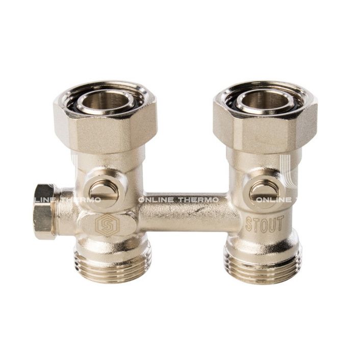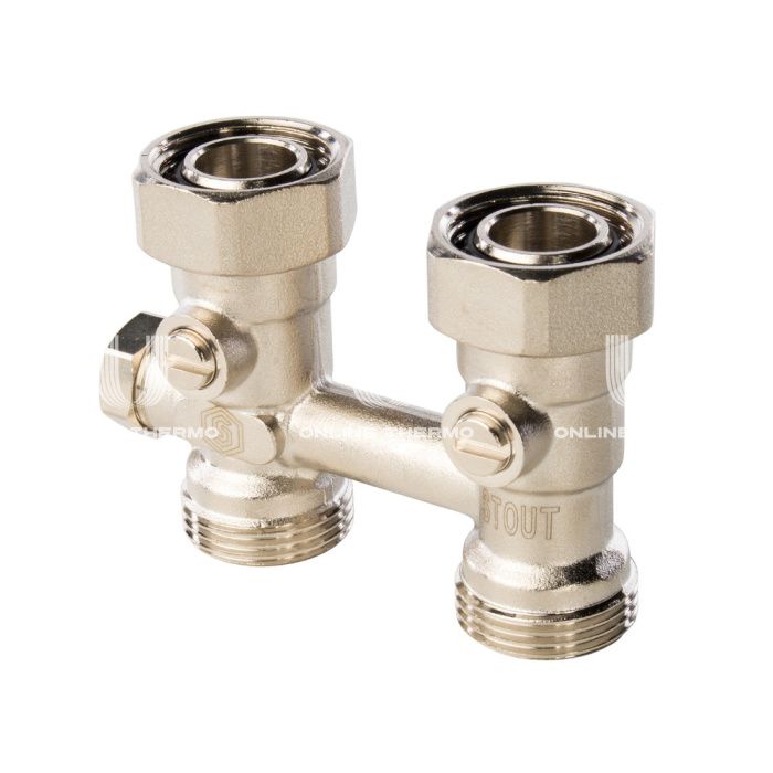 Запорно-присоединительные узлы с регулируемым байпасом Stout серии SVH изготавливаются в Италии и предназначены для подключения радиаторов с нижним расположением присоединительных патрубков к разводящим трубопроводам однотрубной и двухтрубной системы водяного отопления, а также для отключения радиаторов от трубопроводной сети без опорожнения системы отопления. Запорно-присоединительный узел с регулируемым байпасом является универсальным, он состоит из Н-образного корпуса со встроенными шаровыми запорными кранами. На патрубках радиатора узел фиксируется при помощи накидных гаек, герметичность соединения обеспечивают кольцевые уплотнения, установленные на верхних штуцерах. Ниже шаровых кранов, между подающим и обратным патрубком узла, находится перемычка-байпас, которая используется в случае применения узла в однотрубной системе отопления. Перемычка имеет устройство, позволяющее регулировать степень ее открытия. Снаружи шток регулирующего устройства закрыт защитным колпачком. Для соединения с трубопроводами системы отопления, нижняя часть узла оборудована наружной резьбой под присоединение компрессионных фитингов типа «Евроконус». У запорно-присоединительного узла в угловом исполнении корпус выполнен в виде угольника, что позволяет производить подключение радиатора к трубопроводам, скрытым в стенах. Для поворота шаровых кранов, на штоке запорного механизма выполнены шлицы под плоские предметы, например, монету, отвертку, нож и др.