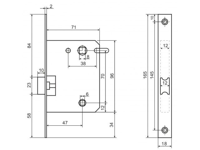 Универсальная защёлка врезная для установки на деревянные межкомнатные двери. Материал - сталь, гальваническое покрытие.Под ручку с квадратом 8 мм и сантехническую завертку с квадратом 6 мм. Удаление ключевого отверстия - 47 мм. Межосевое расстояние - 70 мм. Прямоугольная торцевая планка. Ширина планки - 18мм. Габариты корпуса - 96х71х12 мм. В комплекте - защелка, саморезы, ответная планка и белый пластиковый вкладыш к ней.